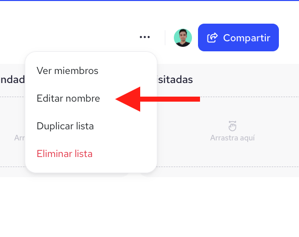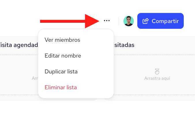 Para renombrar o eliminar una etapa: haz clic en los 3 puntos ubicados en la parte superior derecha de la etapa que quieres personalizar.