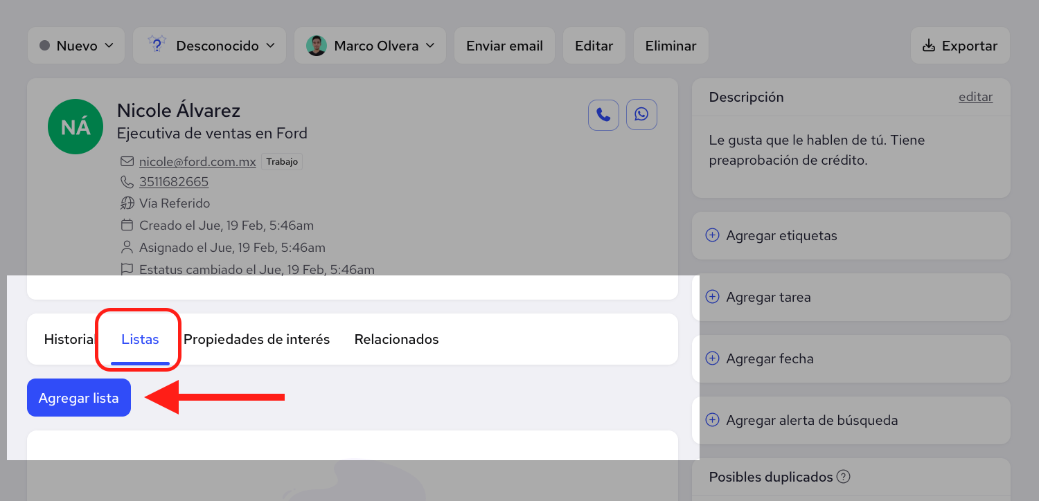 Dentro de la ficha del contacto, haz clic en la pestaña Listas y presiona Agregar lista.