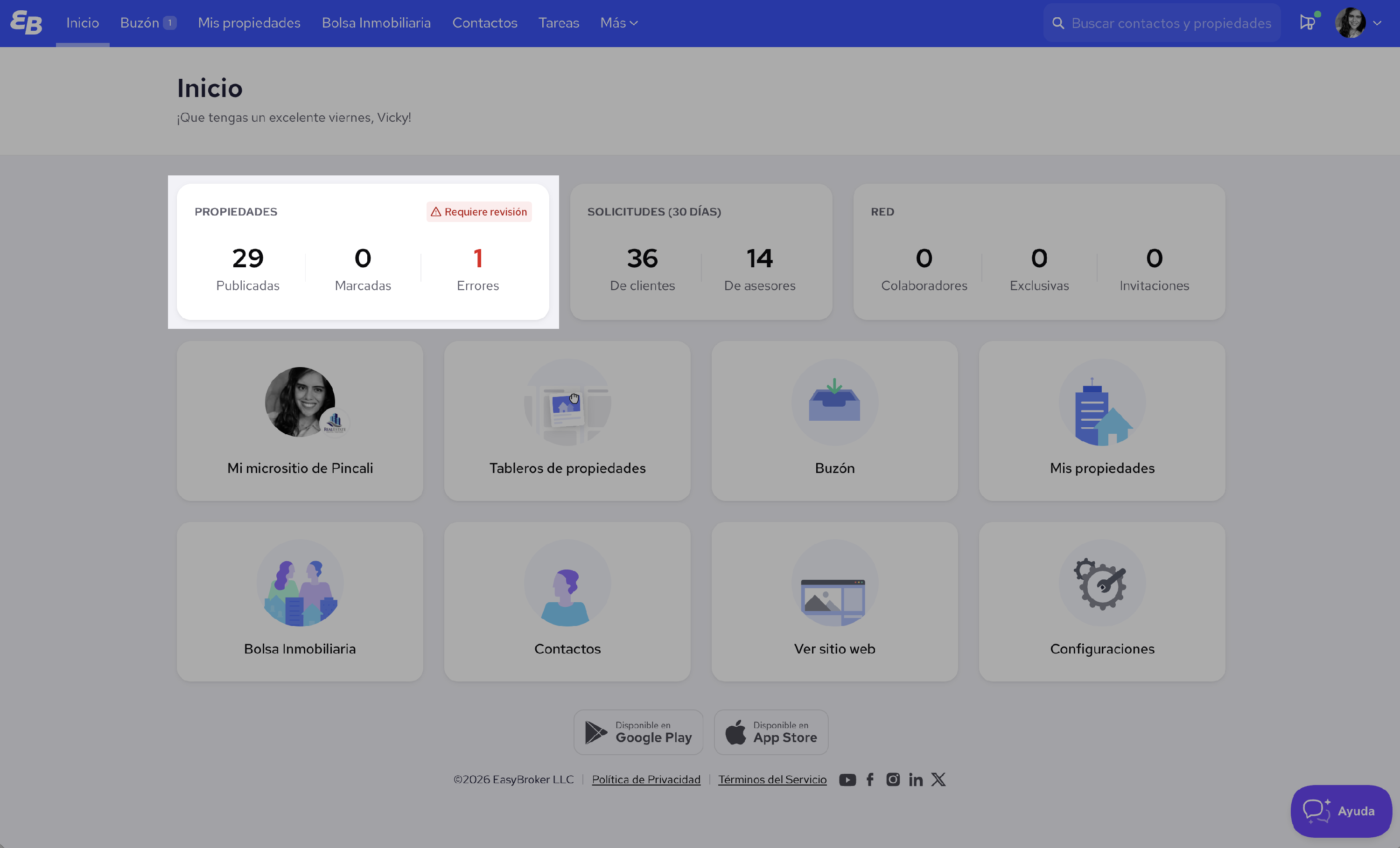 En la página de Inicio de EasyBroker encontrarás la sección Propiedades. Ahí podrás ver cuántas propiedades tienes publicadas, si alguna está marcada para revisión y si existen errores de publicación.