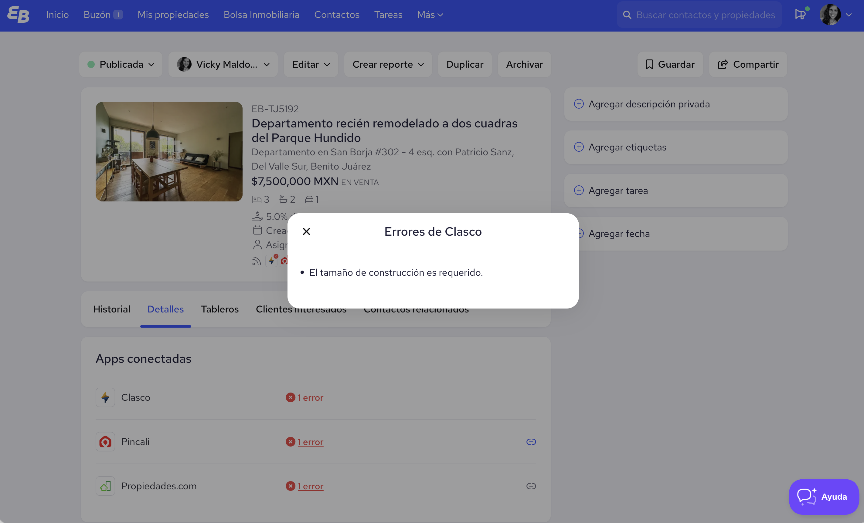 - Elige una propiedad, entra a su ficha y da clic en la sección Detalles. Ahí te aparecerá el portal inmobiliario que reporta el error.