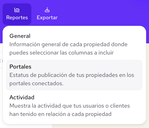 Si necesitas consultar varias propiedades, una forma sencilla es creando el Reporte de Portales. Está disponible para que lo hagas desde tu computadora, aunque aún no está para app móvil. Para crearlo: