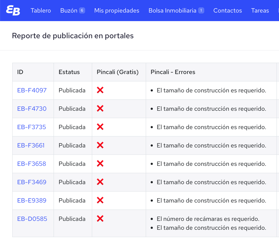Los errores de publicación se muestran en color rojo. Para ver qué propiedades tienen error, da clic en el número en rojo. Esto te llevará al reporte de portales, donde podrás ver el motivo en cada caso.