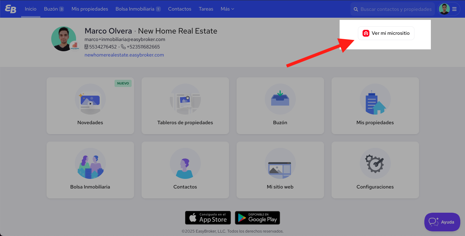 Desde tu página de Inicio en EasyBroker, haz clic en Ver mi micrositio para abrirlo.