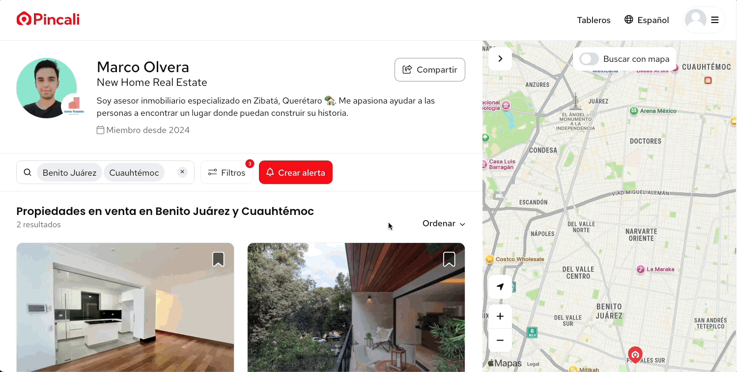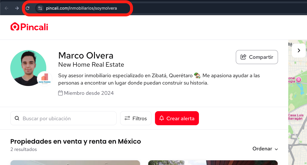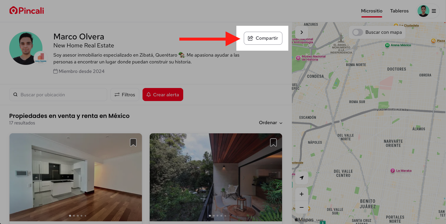 Si eres asesor en México y publicas en Pincali, cuentas con un micrositio: un sitio web personal donde puedes mostrar tu perfil profesional y compartir todas tus propiedades y las de tu inmobiliaria con un solo enlace, mostrando únicamente tus datos de contacto.