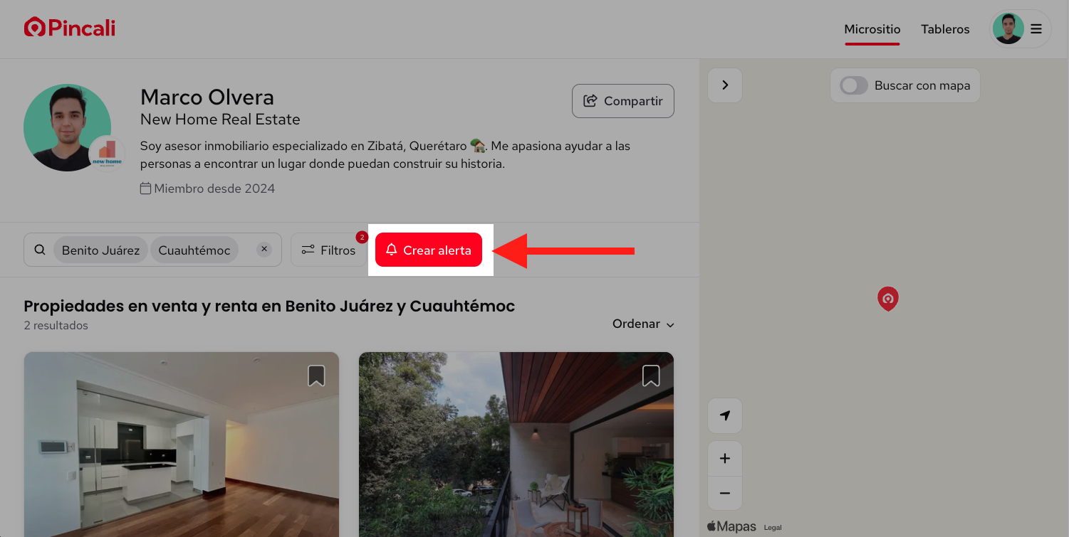 - Recibir alertas: pueden activar alertas para recibir notificaciones cuando se publiquen nuevas propiedades en tu micrositio que coincidan con sus intereses.