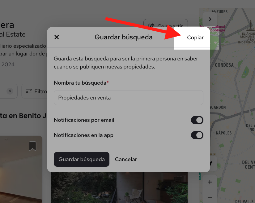 Si no quieres guardar la alerta también para ti, haz clic en Copiar para obtener el enlace de la búsqueda y compártelo con tu cliente.