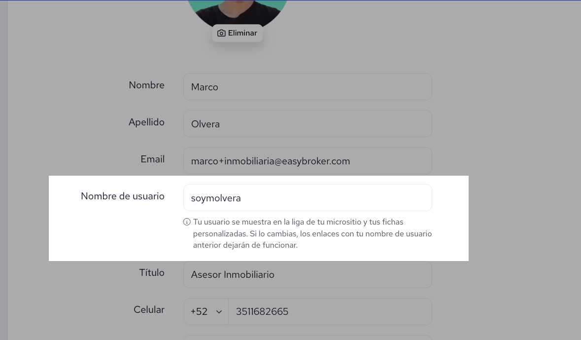 Si quieres cambiar el nombre de usuario que aparece en el enlace de tu micrositio y en tus fichas personalizadas, puedes hacerlo desde Editar perfil.