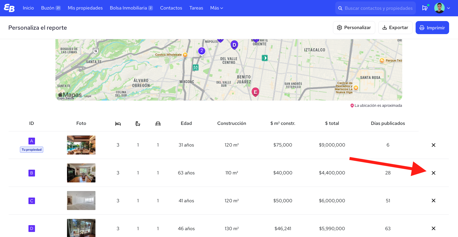 - Se creará un reporte con el precio promedio de las propiedades seleccionadas y una tabla comparativa que puedes personalizar según las columnas que quieras mostrar.