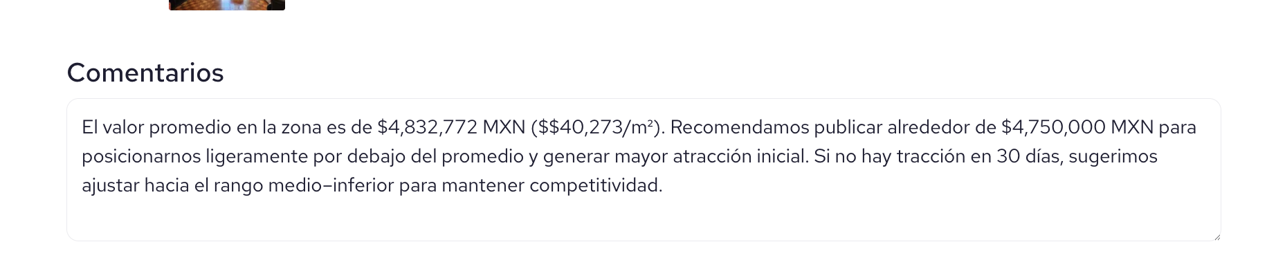 Se generará automáticamente el análisis con propiedades similares a la tuya que estén dentro de la misma colonia o barrio. Si no se encuentran suficientes opciones, la búsqueda se amplía a la ciudad para poder generar el reporte. En esos casos pueden aparecer zonas con niveles de precio distintos, por lo que puedes eliminar manualmente las propiedades que no consideres adecuadas.